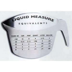 - Lists ounce, cup, pints, -quarts, liters and gallons