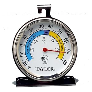 Featuring top quality engineering by the Taylor company, this refrigerator/freezer thermometer registers temperatures from between -20 to 80 degrees F. An extra-large 3-1/4-inch dial lets users get an accurate reading at a glance. Constructed from durable stainless-steel, the thermometer is NSF listed. The thermometer is easy to hang or stand, so it fits where it's most needed in any fridge or freezer.